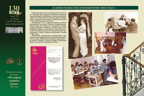 В 1988 году большая часть помещений в доме №5 по ул. Чигирина была передана Московским районным отделом народного образования в аренду кооперативу «Престиж». Основателями одного из первых кооперативов в Харькове были супруги Клавдия Николаевна и Анатолий Исаакович Бахмутские.
