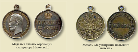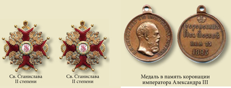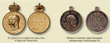 Имел медали серебряные за труды по устройству крестьян в Царстве Польском, в память царствования императора Александра ІІІ, в память коронации Николая II и бронзовыми – в память усмирения Польского мятежа 1863–1864 годов и в память коронации Александра ІІІ.