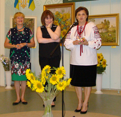 Ну а отпраздновали юбилей, конечно, дома: в родной Гостиной, как всегда, шумно, весело и содержательно. Сначала от имени членов клуба к гостям обратилась хозяйка Гостиной: «Общественная организация клубного типа «Гостиная на Дворянской» отмечает свое десятилетие открытием коллективной выставки творческих работ участников клуба под названием «Солнце в цветке». Экспозиция выставки, посвященная подсолнуху, знакомит с разножанровыми работами на заданную тему представителей изобразительного крыла «Гостиной на Дворянской» — живописцев, скульпторов, фотохудожников, дизайнеров, мастеров народного творчества. Здесь же представлены картины с изображением подсолнухов, находящиеся в частных коллекциях участников клуба и в Харьковском художественном музее, коллектив которого активно сотрудничает с «Гостиной на Дворянской». О художественном уровне выставки можно судить по перечню имен авторов, большинство из которых народные, заслуженные и титулованные, причем заслуженно. Выбор темы выставки созвучен сегодняшнему отрезку времени в истории Украины. В геральдике подсолнух олицетворяет мир и единство, которые так желанны для нас всех, независимо от этнической принадлежности, языка общения, вероисповедания, политических симпатий и антипатий. Подобно подсолнуху, устремленному к солнцу, и мы обращаемся к могущественному светилу с просьбой согреть наши души и растопить лед непонимания. Присоединяйтесь!»